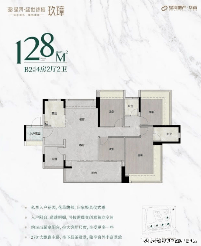 128平方米户型:独立入户花园设计,厨房、客餐厅和主卧尺度大幅提升,营造宽敞明亮的居住环境。