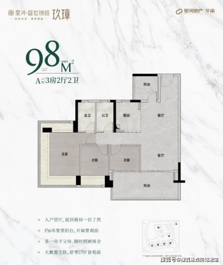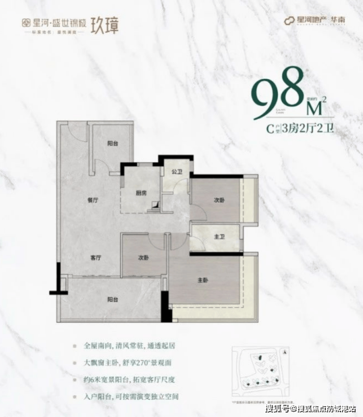98平方米户型:主朝向朝南,配备270°无柱飘窗,视野开阔,次卧和阳台尺度大幅增加,提供更加舒适的居住体验。