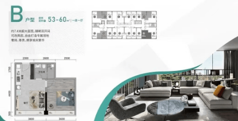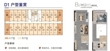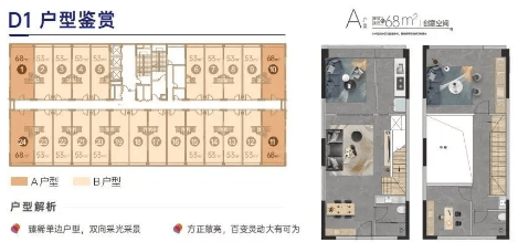 D-2公寓:涵盖36-45㎡大单间、53-60㎡一房一厅、63-68㎡两房一厅等多种户型。