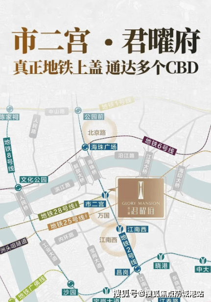 君曜府位于 2/28 号线 (广佛段在建中) 交汇点市二宫站上盖,距离地铁 8 号线市二宫站不到 200 米,是名副其实的地铁上盖项目。2 号线畅连北京路、万国、江南西等多个商圈,快速通达珠江新城、琶洲等 CBD。待 28 号线(佛穗莞城际)这条 160km/h 的市域高速轨道开通后,从市二宫站出发,3 站即可到达琶洲,快速连通广佛莞三市中心城区,为您的出行提供极大便利。