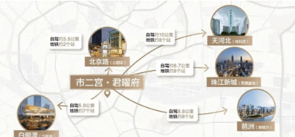 君曜府楼下就是市二宫商圈,新市二宫设有网球场、游泳馆、电影院等,满足您文化教育、娱乐休闲等多重需求。1 公里范围内,万国广场、江南西、海珠广场、北京路等 5 大知名商圈覆盖,构筑都荟新潮生活聚场,让您尽享都市繁华。