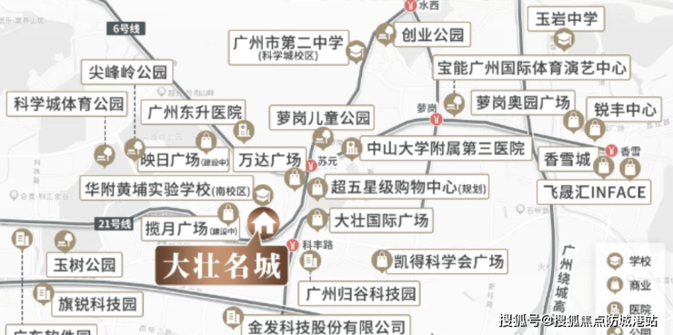 教育方面,社区自带华南师范大学附属黄埔实验学校,提供九年一贯制优质教育,周边5公里内汇聚超20所知名学校,教育资源稀缺且确定性高。商业配套方面,步行范围内有万达广场、科学城商业广场及至泰广场,社区自身增量大壮国际广场AB地块规划超五星级购物中心,实现高端商业生活圈覆盖。医疗方面,广州东升医院及中山大学附属第三医院岭南医院近距离保障居民健康需求。