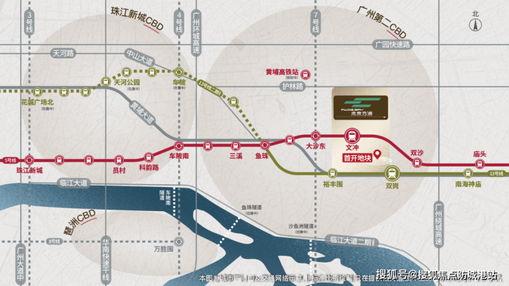 中建玖合·未来方洲所处区域优势明显,珠金琶CBD作为广州总部经济、金融行业、科创产业的头部聚集高地,与鱼珠CBD一体化进程加深,生活圈成型。项目通过多路网迅达珠金琶CBD,双黄金地铁线5号线文冲站及13号线双岗站,3站到金融城,6站达琶洲,9站直达珠江新城板块。城市主动脉如黄埔大道、临江大道等贯通珠金琶CBD核心,广深沿江高速连接东莞、深圳,规划中的黄埔高铁站10线联通大湾区,交通极为便捷。在生活配套方面,5公里内无缝享受CBD商圈,美林天地、山姆会员等都会配套一应俱全,还有规划中的开市客、华润万象系商业等。约2公里内有中大附属第一医院(东院区)和广州医科大学附属第五医院双三甲护航,约1公里可达黄埔图书馆、广州市第三少年宫、黄埔体育馆三馆环绕,为居民提供全方位的生活保障。