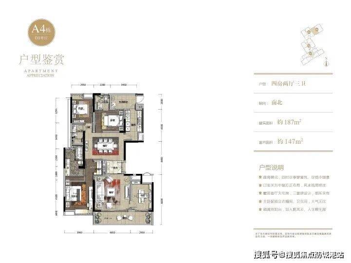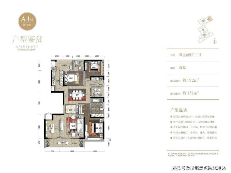本次上新的货量主要是188/193平方米的大四房奢宅,功能分区清晰,适合多孩家庭或三代同住。以192平方米四房两厅三卫为例: