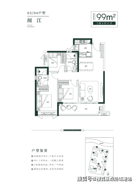 建面约99平方米的三房两厅两卫户型:采用经典竖厅设计,户型方正实用;配备约6.2米长的阳台,一线瞰江揽景;U型宽厨布局,烹饪更加流畅;主卧套房空间开阔,舒适宜人。