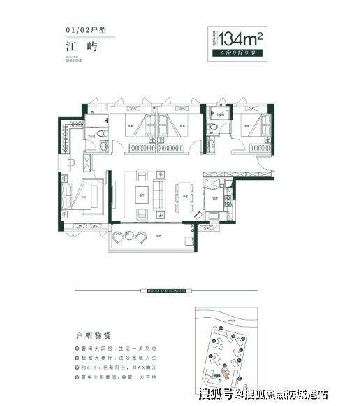 建面约134平方米的四房两厅两卫户型:超开阔横厅设计,带来更宽敞的居住感受;约6.8米巨幕阳台,IMAX级瞰江视野;豪华主卧套间,典藏一方天地,尽显生活品质。