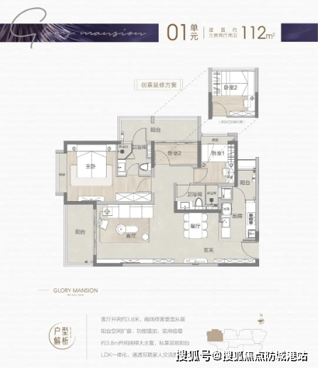 建面112㎡三房两卫户型,总价569万起,空间尺度更为宽裕,采光面充足,每间卧室都带有实用飘窗,既增加了采光与通风,又能拓展收纳空间,提高空间利用率。客、餐、厨与阳台贯通一体,约3.8米宽厅带来开阔视野,形成既独立又融合的家庭核心区,平时招待客人也更有面子。主卧套房设计更为贴心,卫生间巧妙连通阳台,打造专属“先生的阳台”,满足家庭成员的个性化需求。