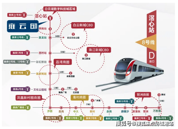 招商・雍云邸位于白云湖数字科技城,该区域规划分三期建设(2019-2030 年),未来将容纳 28 万人口、41 万就业人口,发展潜力可观。交通方面,项目距地铁 8 号线滘心站仅约 600 米,8 号线被誉为 “换乘之王”,可换乘 1、2、3 号线及广佛线等,贯穿老荔湾、海珠西、琶洲等区域;自驾可依托三高速(华快、广佛肇、广清高速),35 分钟畅达天河、海珠、荔湾,还可衔接白云站 TOD(规划 1 轻轨 + 2 高铁 + 7 地铁),便捷串联大湾区。周边配套逐步完善,600 米内有嘉福商业广场、万民百货,未来还有超大型商业综合体规划;医疗上,广州市第一人民医院已签约进驻白云湖数字科技城,为健康保驾护航。