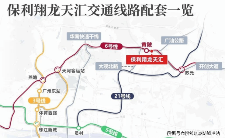保利翔龙天汇紧邻地铁6号线黄陂站,直线距离仅400米,步行即可到达。通过地铁6号线,居民可以便捷地前往天河、越秀、荔湾等地,无需换乘。此外,项目周边还有广汕路、广园快速等多条主干道,形成了“五横三纵”的立体交通网络,自驾出行同样非常方便。