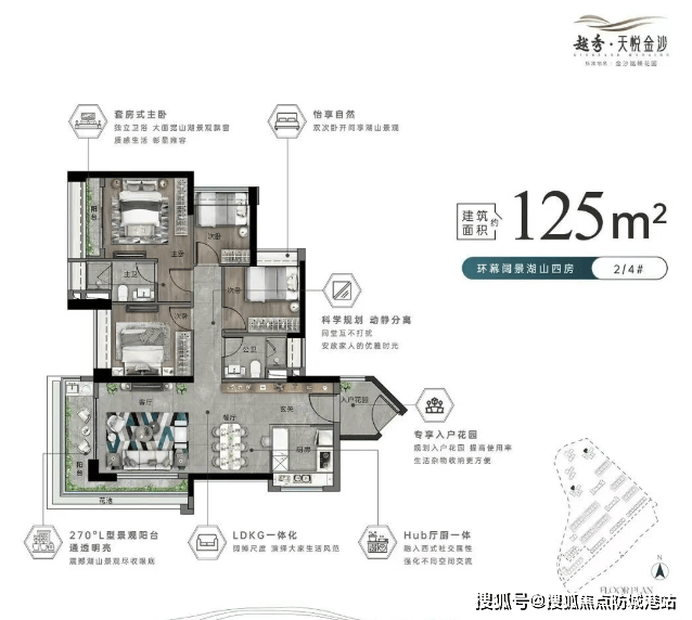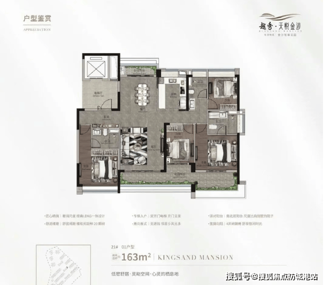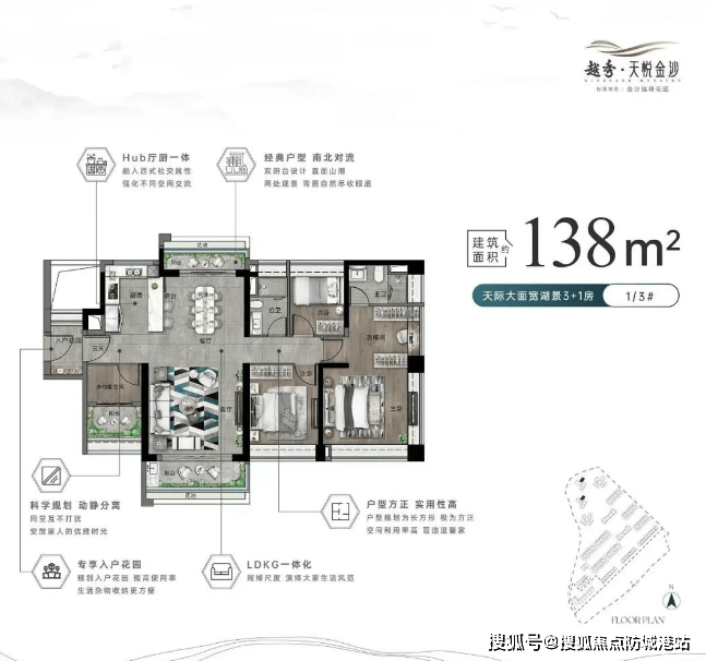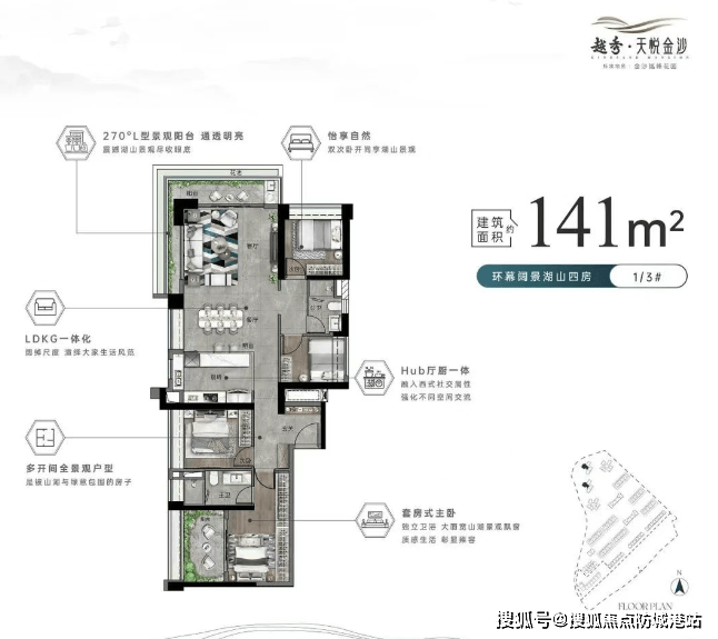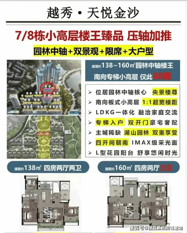 建面约138-160㎡:南向四房带主套,超高层湖山IMAX景观四房户型,多面宽+270℃观景阳台。