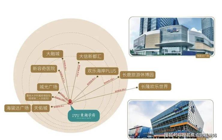 下楼即达4万方商业体城光城市广场,直线距离天佑城、海骏达广场仅3公里,直线距离美的万达广场、容桂渔人码头仅4公里,直线距离欢乐海岸约6公里,直线距离长鹿旅游休博约13公里,直线距离广州长隆欢乐世界约26公里。