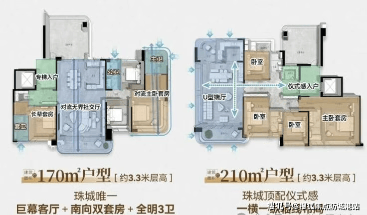3. 170-220㎡四房:改善顶配,品质尊享。该户型空间开阔,布局合理,部分户型可直接俯瞰珠江,享受一线江景视野。两梯两户的配置,带来极致的私密体验,让业主的归家仪式感拉满。此外,户型还配备了中央空调整温、全热交换新风系统,双层中空LOW-E玻璃能有效隔绝噪音与紫外线,打造恒温、恒湿、恒净、安静的居住环境。针对广州湿热多雨的气候特征,项目还创新研发了“七衡系统”,以匠心科技守护居者长久健康,让居住体验更上一层楼。