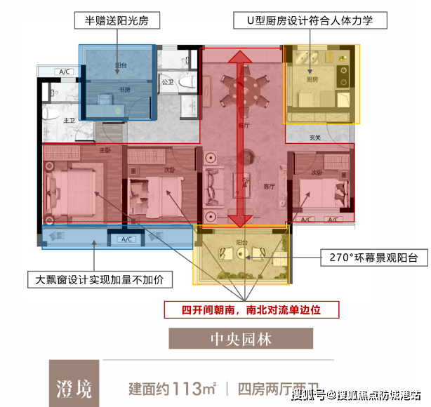 建面约113㎡阔景四房:南北通透,舒居典范,全景飘窗设计引景入室,主次卧双套房设计尊享私密,适合追求高品质生活的大家庭。