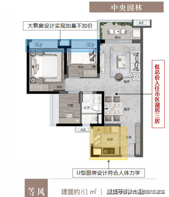 建面约81㎡三房两厅:全能三房设计,低总价门槛,适合年轻家庭轻松入驻。南向瞰湖视野,得房率超90%,是功能齐全的理想选择。
