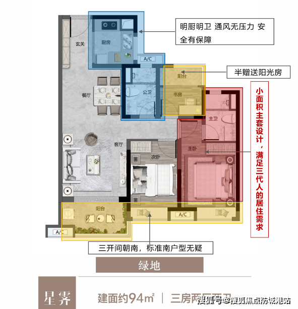 建面约94㎡臻品三房:南向主套设计,阳光礼遇,全明通透,清风常伴,惊喜阳光房赠送,提供舒适的生活体验。