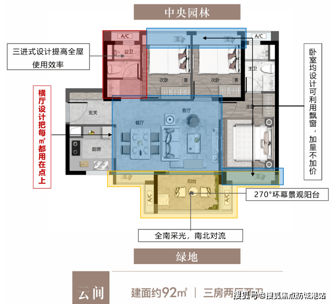 建面约90㎡全能三房:全南向采光,三卧飘窗赠面积,同等面积多一卫加配不加价,高拓空间,得房率超92%。