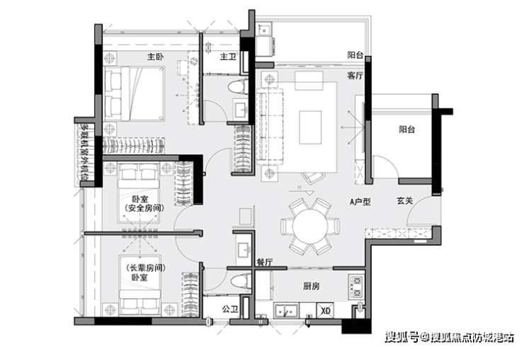 04户型-建面约121m²四房两卫 这款户型以奢阔层高为特色,市区稀有的约3.15米层高大宅,空间体验感开阔。客餐厅开间达到4米,主卧配备衣帽间,U型厨房布局合理,公卫干湿分离,整个格局方正实用,动静分区明确。