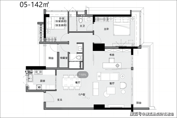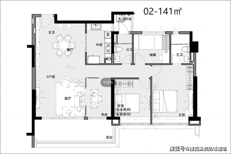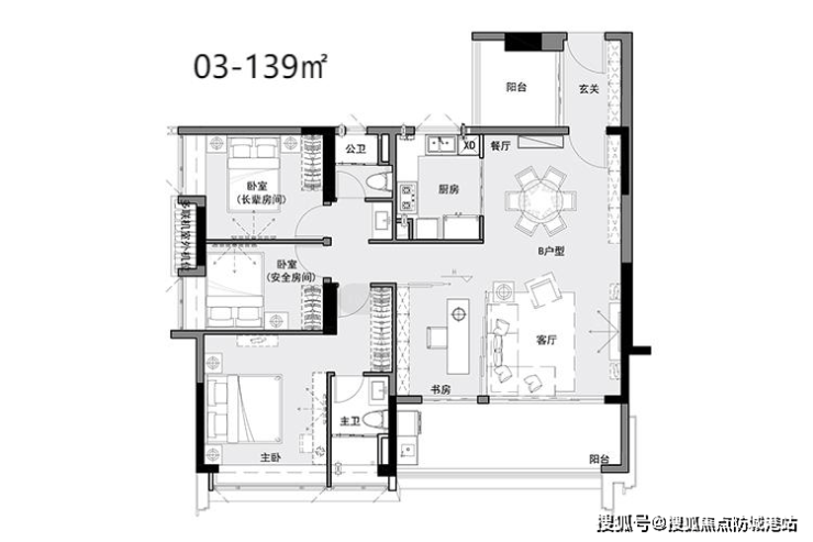 02/03/05户型-建面约139-142m²四房两卫 同样享有约3.15米的层高,6-7米双联阳台设计使得空间更加宽敞明亮。其中02户型特别配备了双阳台,而05户型则为主卧设计了270°飘窗,进一步提升了居住舒适度。
