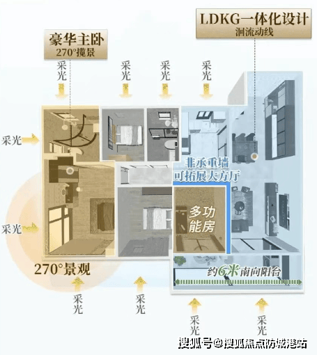 建面约76㎡的三房两卫,独立入户玄关,增加收纳空间,LDKG一体化设计,南北对流设计,主卧带270度景观。