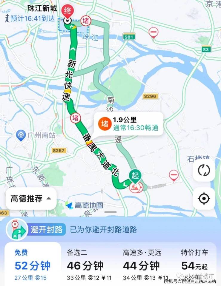 自驾去往珠江新城:上番禺大道北转新光快速,27公里可到珠江新城,全程耗时52分钟,上高速的情况下能控制在50分钟以内。
