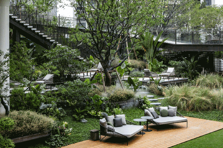 项目的空中园林惊人地大,约2万平的体量接近于一个普通楼盘的面积,大片草坪、灌木、乔木高低错落,在这座“自然森林”驻足片刻,连空气都是慢悠悠的。