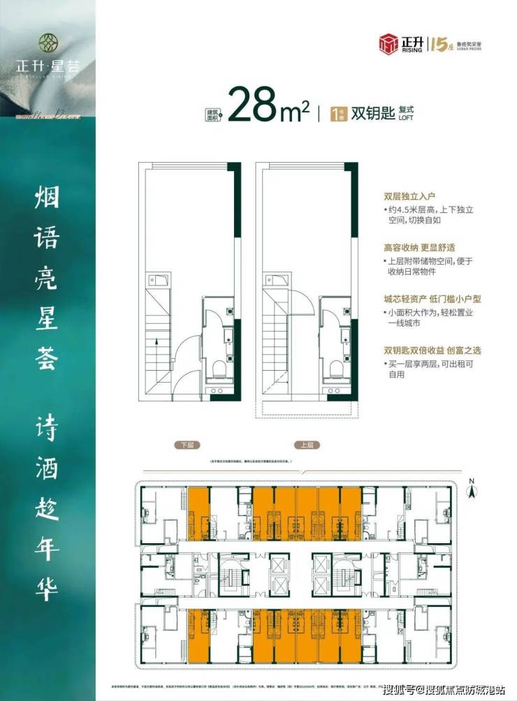 低密奢装与空间革新是正升·星荟的一大特色。项目不限购,提供精装建面约28-63㎡的百变空间选择,涵盖平层、复式(loft)、双钥匙户型。特别是建面约28㎡至臻双钥匙户型,楼上自用楼下出租或者分开出租,收获双倍租金,小面积低总价让投资回报更加可观。约4.5米超值层高创意空间设计,随心改造为观景空间、书房、影音室等个性化空间,重新定义爆款loft风潮。