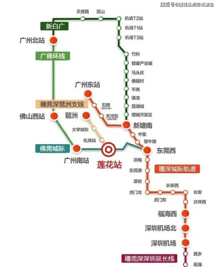 当然,这还不够,政府还在莲花湾片区打造了一个莲花站,这个站位于穗莞深城际(琶洲支线)与佛莞城际的交汇点,未来通过它,可实现一站到广州南站、两站到大学城、三站到琶洲👇