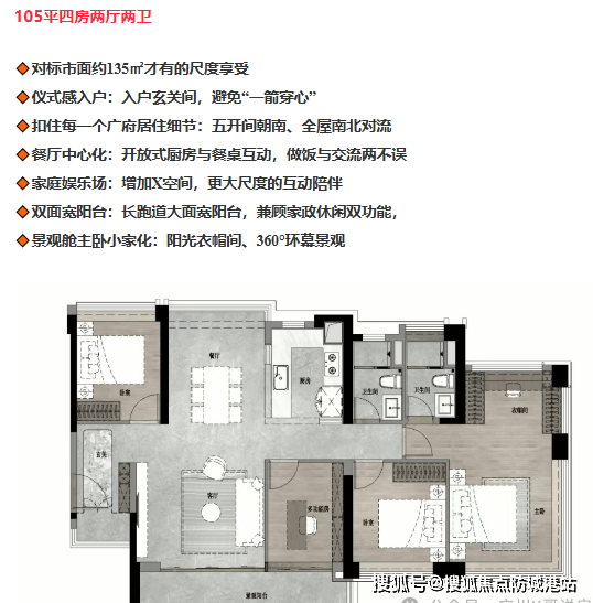▶️ 105㎡「空间诗人」:五开间朝南+双面宽阳台,开放式餐厨变身家庭社交中心