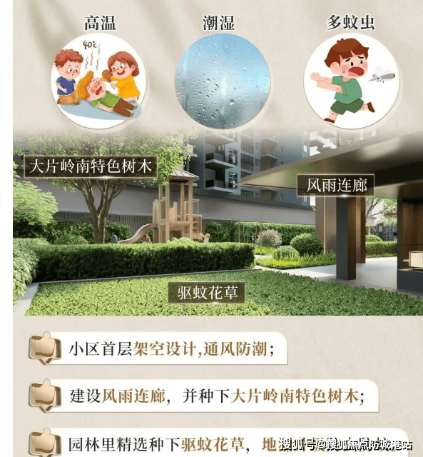 针对广州回南天、夏季多雨暴晒、蚊虫多的气候特色,社区做了全方位优化:首层采用立体架空设计,通风防潮;修建风雨连廊,遮雨遮阳;种植高大树木及特色驱蚊植物,地漏采用防虫防蚊设计,全方位提升居住舒适度。