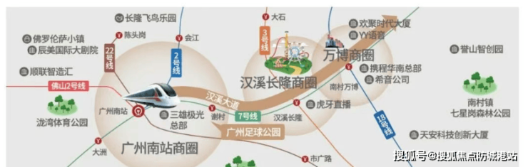 项目位于广州南站国际交通枢纽辐射圈内,尽揽14轨交汇立体交通网络。距离地铁7号线谢村站仅约300米,2站直达广州南站,3站即可到达万博CBD。通过广佛环线、佛山地铁2号线等多条轨道交通线路,实现1小时大湾区都会圈的高效通勤。此外,汉溪大道正在建设中,将进一步串联广州南站、长隆、万博等核心板块,提升区域交通便利性。
