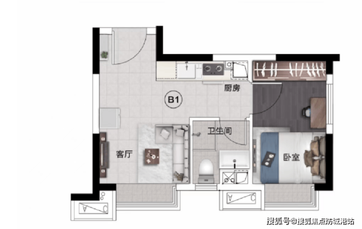 44㎡一室一厅一卫: 入户玄关设计,私享生活空间;全明设计,采光通透;奢阔飘窗,视野开阔;国企精工,彰显品质。适合单身贵族或年轻情侣,低总价高实用。