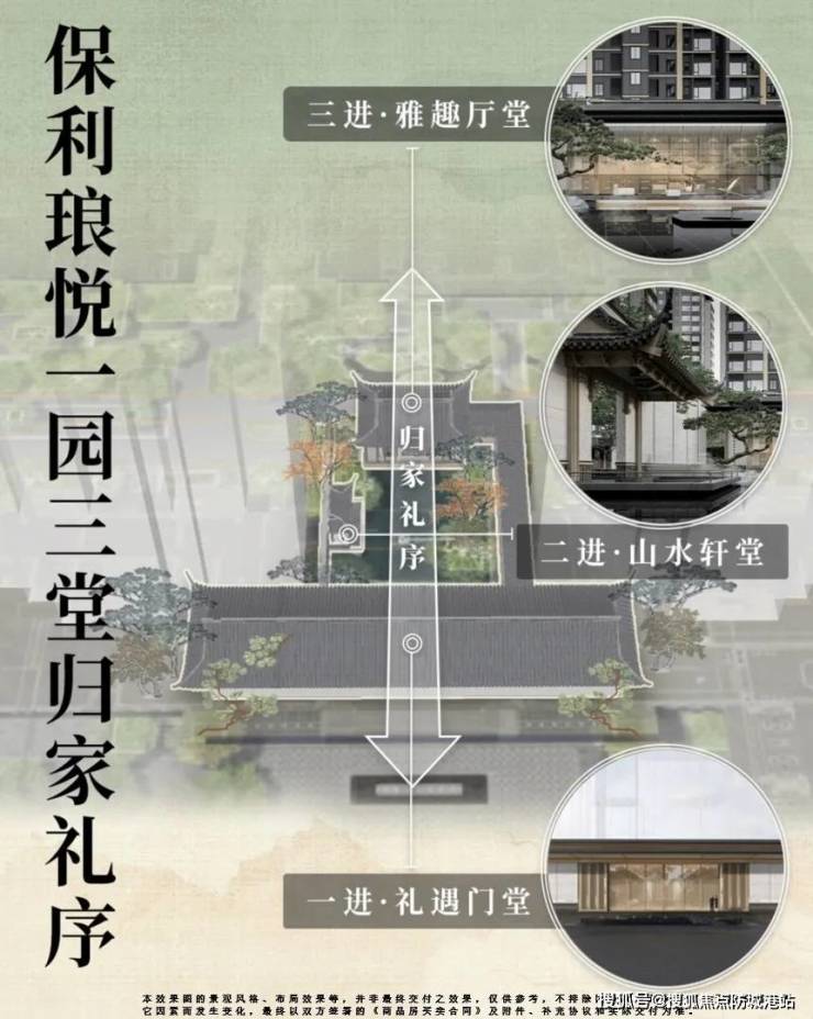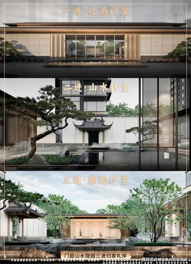 项目以"宋式美学"为设计灵感,打造"一轴三进九境"的园林体系: