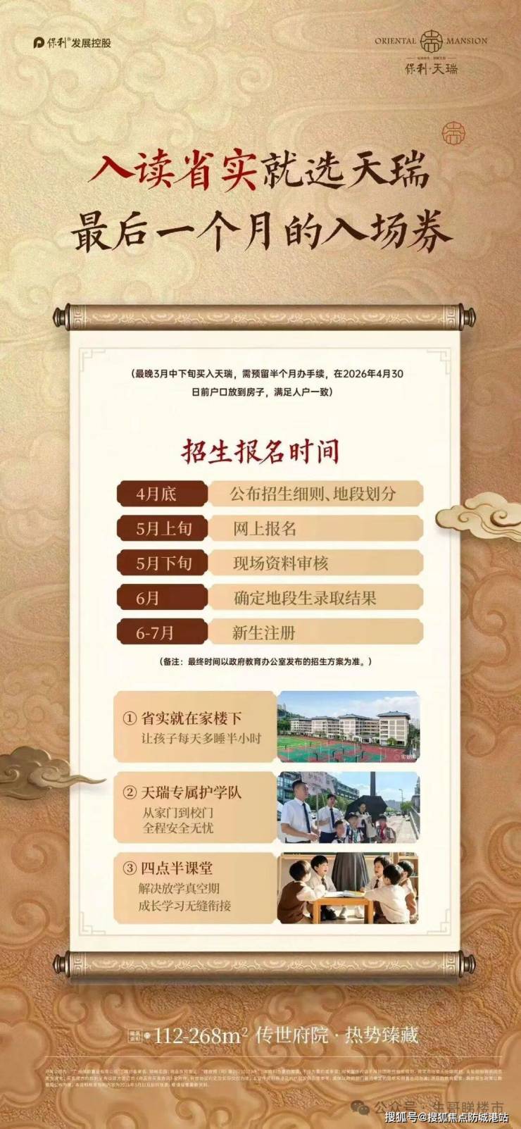 我实地实测过,从项目小区门口到学校大门,步行仅需 3 分钟,孩子上学不用早起赶车,家长也不用长途奔波接送,日常上下学非常安全便捷。除此之外,项目还为业主打造了专属的护学服务,建立了业主接送社群,每天安排 2 个秩序员 + 1 个管家,开电瓶车护送孩子从小区到学校,再从学校接回小区,如果家长不在家,孩子还可以先到服务中心让管家照看,后续还将开设四点半课堂,解决双职工家庭的育儿痛点,这些超出预期的教育服务,都是我们给业主的专属保障。很多中介在介绍学区的时候,只会给你画大饼,说 “未来会引进名校”,却拿不出教育局的官方文件,更不敢给你任何确定性的承诺,而保利天瑞的学校已经正式开学,招生地段也有教育局官方文件公示,完全没有入学风险,这对于重视教育的家庭来说,是不是最核心的保障?相关招生政策可在天河区教育局官网查询,验证信息来源为广州市城乡住建局。