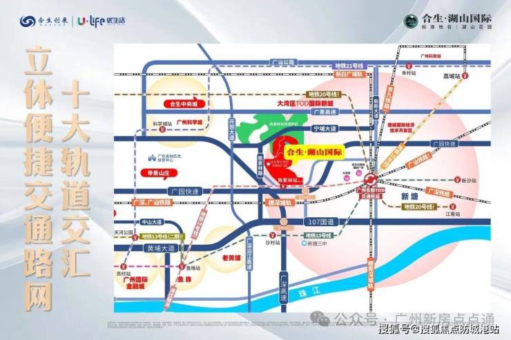项目地处广州东进战略核心节点,位于新塘与科学城双城中轴核心位置,处于科学城黄金一公里辐射范围,全面承接科学城产业外溢与人口导入红利。项目距离科学城核心区直线距离约 5 公里,距离广州东部交通枢纽新塘 TOD 核心区约 3 公里,处于双城发展的核心交汇地带,区位价值突出。新塘 TOD 作为广州东部核心交通枢纽,汇聚广深铁路、广汕高铁、赣深高铁等多条国家级轨道交通线路,同时覆盖地铁 13 号线、5 号线东延段等城市轨道交通,实现 7 站直达天河 CBD,30 分钟通达广州主城核心区,1 小时覆盖深圳、东莞、佛山等大湾区核心城市,是广州连接大湾区的核心门户。
