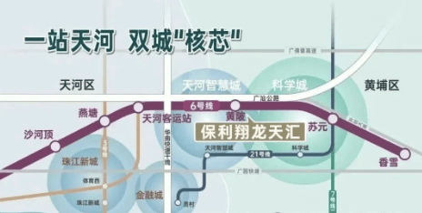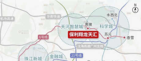 地理位置: 保利翔龙天汇位于黄埔区科学城的核心区域,周边有多条高速公路网,北面紧靠广汕路,通过广园快速、广佛肇高速等“五横三纵”路网,畅达中心城区。项目步行约400米即到6号线黄陂地铁站,自驾约20公里能到达珠江新城,约17公里到琶洲。