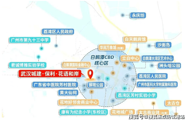 保利·花语和岸,由央企保利发展与武汉城建强强联袂打造,落子广州荔湾白鹅潭CBD核心腹地——芳村板块。项目占地约3.13万㎡,总建面8.62万㎡,仅5栋住宅、506户,容积率低至2.67,绿化率达35%,是区域内罕见的低密精奢社区。更关键的是,其位于《荔湾区国土空间总体规划(2021-2035)》明确划定的“一核”——白鹅潭商务区核心区,与广州塔、琶洲、金融城并列五大世界级商圈之一,且是唯一独立成核的西部引擎。项目北临花地河,东接3.6万㎡醉观公园,步行即达珠江滨水绿道,真正实现“CBD里的公园生活”。随着白鹅潭定位全面升级,这里正从老芳村蜕变为广州西翼的价值高地,而花语和岸恰处风暴眼中心。