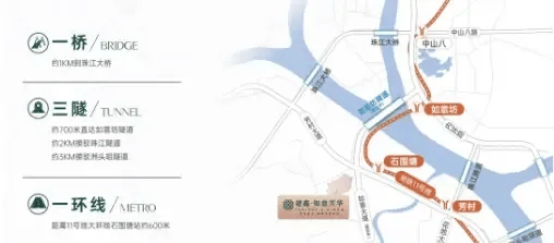 交通方面,项目距在建的如意坊隧道一期仅约700米。该隧道预计2025年通车后,将打通珠江两岸快速通道,大幅缩短前往越秀、海珠等核心区的通勤时间。地铁出行同样便捷——广州地铁11号线(环线)石围塘站步行约600米,8分钟可达。作为广州首条地铁环线,11号线串联天河、越秀、海珠、荔湾四大核心区,换乘多达10余条线路,未来无论通勤还是休闲,都极为高效。