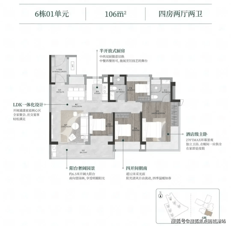 108㎡户型:南北通透,6.8米大阳台,主卧270°转角景观窗,视野与采光双优;