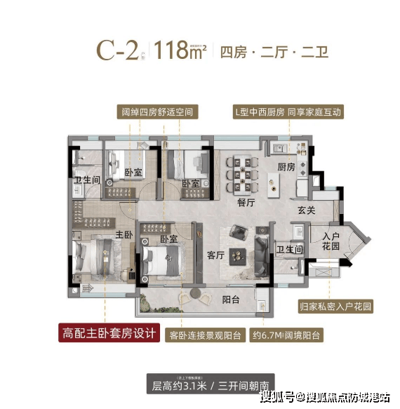 空间亮点:经典竖厅布局,四开间朝南,南北通透;厨房带中岛台,满足多人烹饪需求;双阳台设计,生活阳台与景观阳台分区明确。