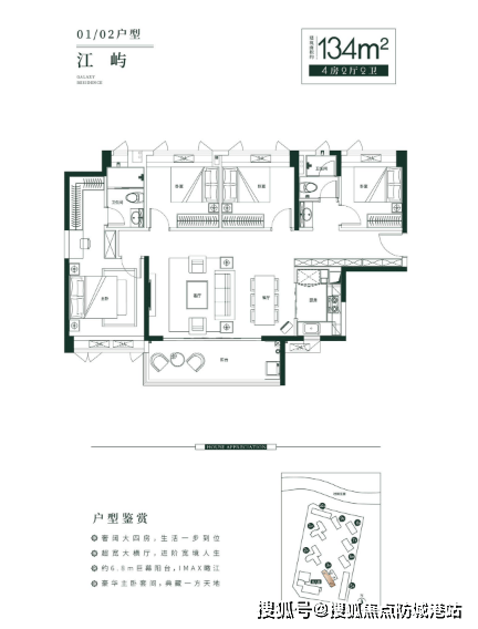 建面约134平方米四房两厅两卫:奢阔大四房设计,适合追求宽敞生活空间的家庭;超开阔横厅设计,进阶宽境人生;约6.8米巨幕阳台,IMAX级瞰江视野;豪华主卧套间,典藏一方天地。