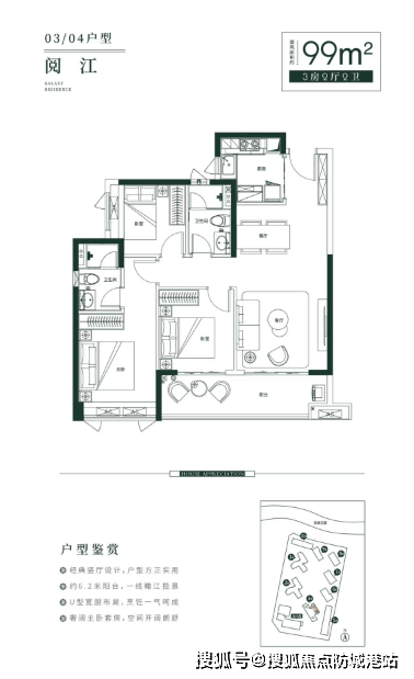 建面约99平方米三房两厅两卫:经典竖厅设计,户型方正实用,配备约6.2米阳台,可以无遮挡瞰江揽景;U型宽厨布局,使得烹饪更加流畅;奢阔主卧套房,空间开阔朗舒。