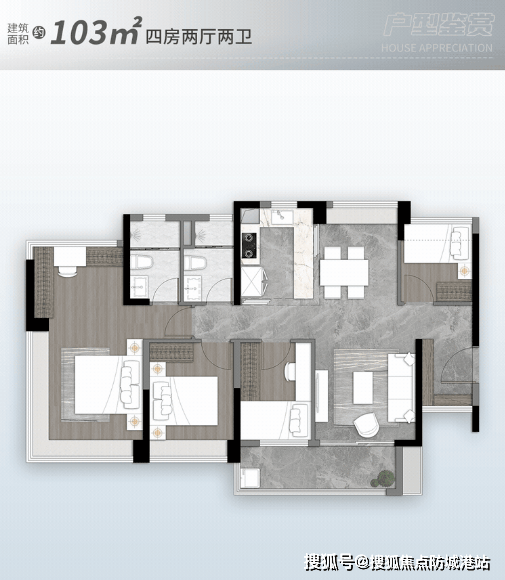 103㎡四房两卫则瞄准多代同堂家庭,五开间朝南带来14米的超大采光面