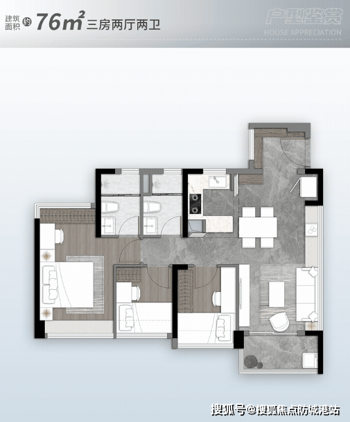 作为刚需上车首选的76㎡三房两卫,做到了四开间朝南