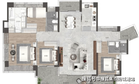 113㎡/118㎡四房两厅两卫:层高同样为3.15米,四开间朝南设计,部分户型主卧配备270°转角飘窗,提供超广角观景体验。