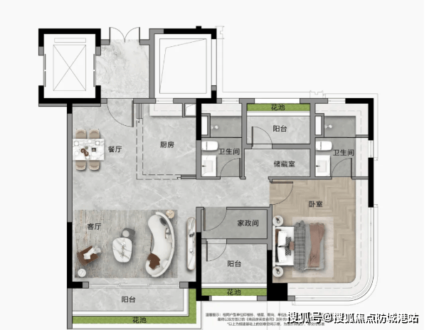 建面约108-110㎡创意空间:片区罕见的小户型设计,带入户花园,最大开间大方厅达4.9米,全屋采光面约12米。