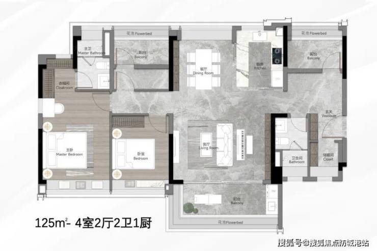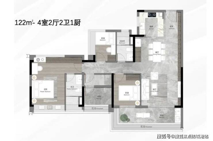 122㎡和125㎡的四房两厅两卫是项目的主力户型,目前5栋仍有较多可选房源,是市场关注度最高的爆款户型。其中,122㎡户型堪称“采光王者”,做到4.5开间朝南,实现南北对流,空气流通性极佳,即使在炎热的岭南夏季,也能保持室内凉爽舒适。主卧带独立卫浴,保障了主人的居住私密性;双面宽阳台设计,一边可用于日常晾晒,一边可打造为观景小天地,闲暇时远眺园林美景,惬意十足。