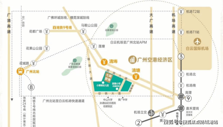 地铁:紧邻地铁9号线清㘵站,3站直达广州北站,6站抵达白云机场,无缝衔接地铁2号线、3号线,快速通达珠江新城、琶洲等核心商圈;