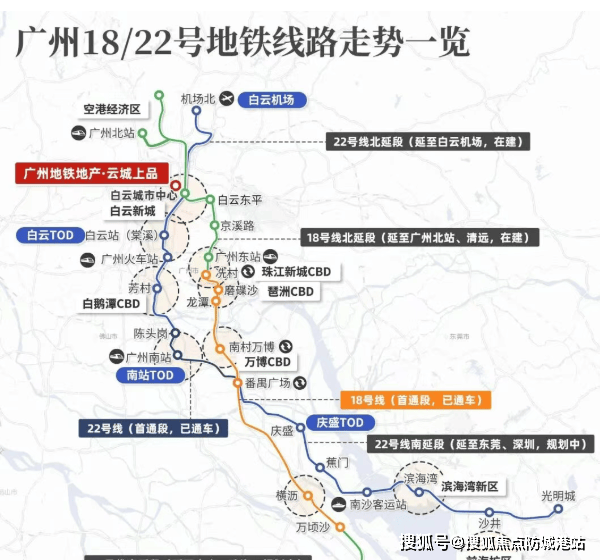 18号线作为贯穿广州南北的“大动脉”,未来可直达广州东站及白云机场,无缝连接琶洲、珠江新城、万博等核心CBD;而22号线则是广州唯一一条串联“海陆空”三大交通枢纽的高速地铁线,贯通广州南站、白云机场、南沙客运港,实现大湾区六大核心枢纽的高效联动。从云城上品出发,3站可达广州东站,4站即抵珠江新城,半小时内轻松抵达市中心,一小时内畅行整个粤港澳大湾区。