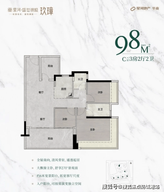 98㎡户型:主朝向朝南,主卧配备270°无柱飘窗,次卧和阳台尺度增加,提升居住体验。