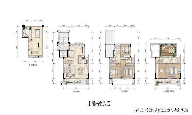 六层餐客厅厨房,七层是休息区共有3间卧室,八层整一层南北通透的大主卧,北有露台南有阳台。